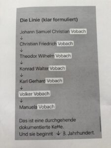Am Anfang der überlieferten Linie steht Johann Christian Vobach (1770–1842), von dem sich die weiteren Linien nach Potsdam, Berlin und darüber hinaus ableiten lassen. Seine Nachkommen prägten das Familiengefüge über mehrere Generationen hinweg und schufen jene wirtschaftlichen und sozialen Verbindungen, aus denen sich später auch die Entwicklung des Verlags W. Vobach & Co. ergibt.